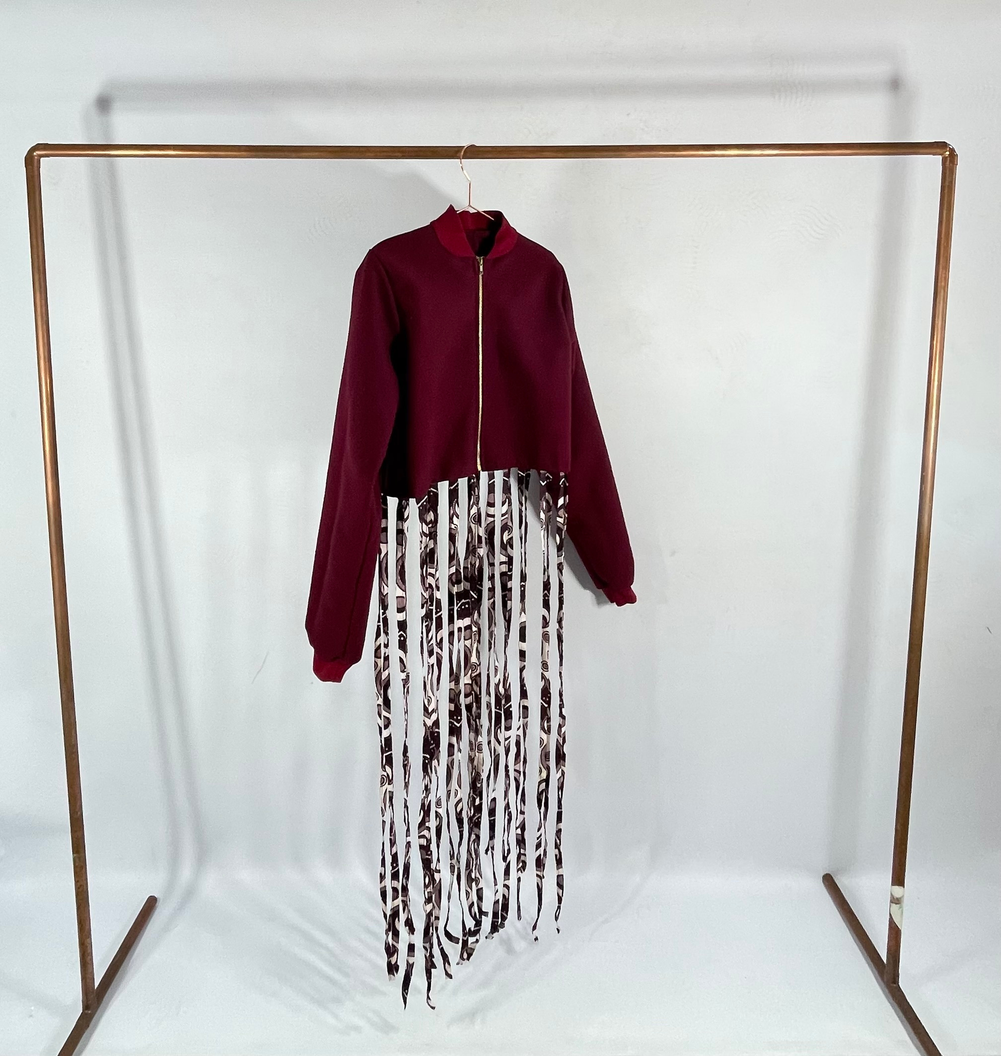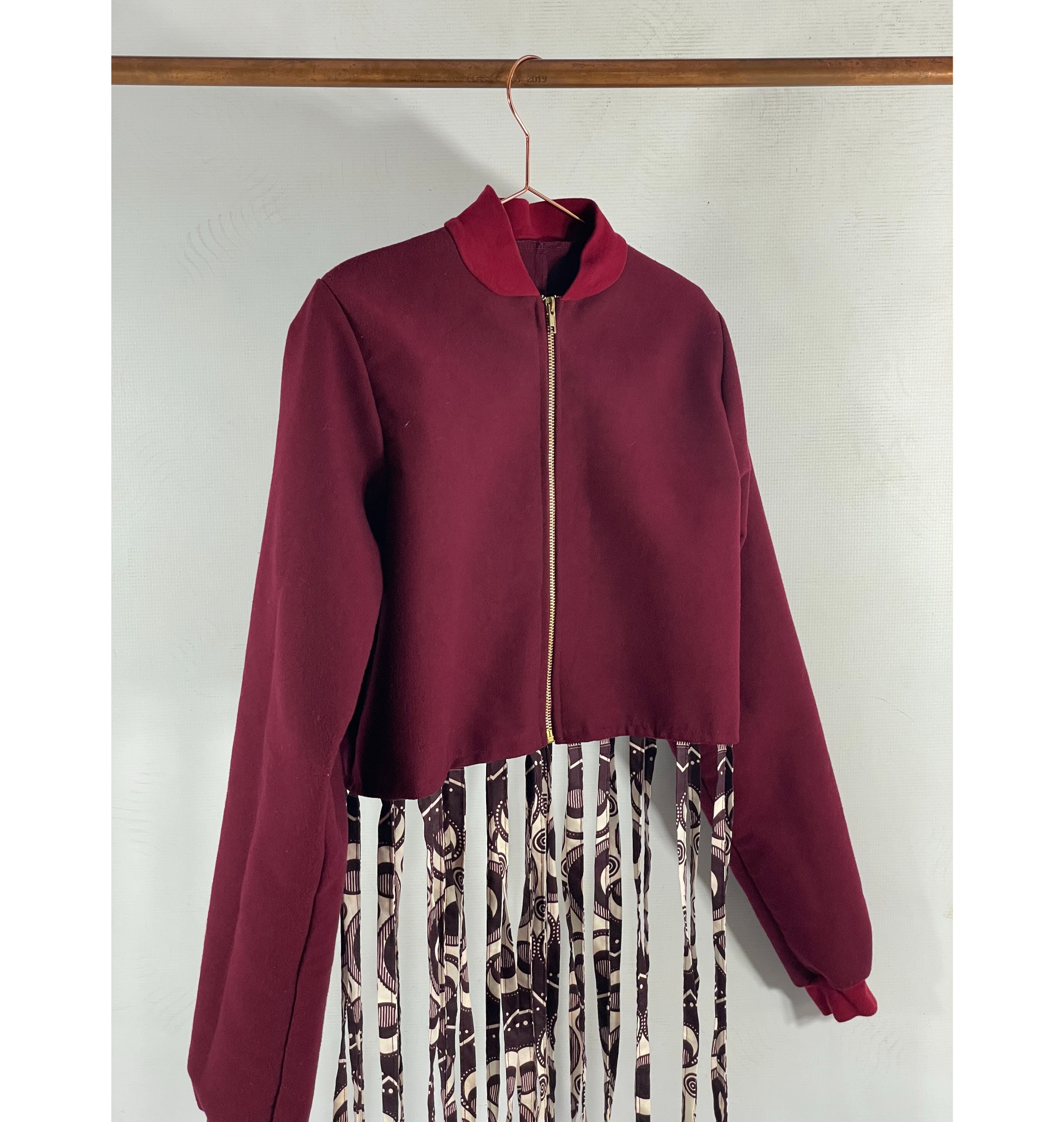 A cropped bomber jacket featuring a textured fabric and decorative fringe detailing.